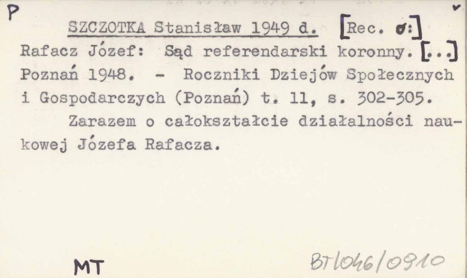 SZCZOTKA Stanisław 1949 d [Rec. o:] Rafacz Józef: Sąd referendarski koronny [...]. Poznań 1948.