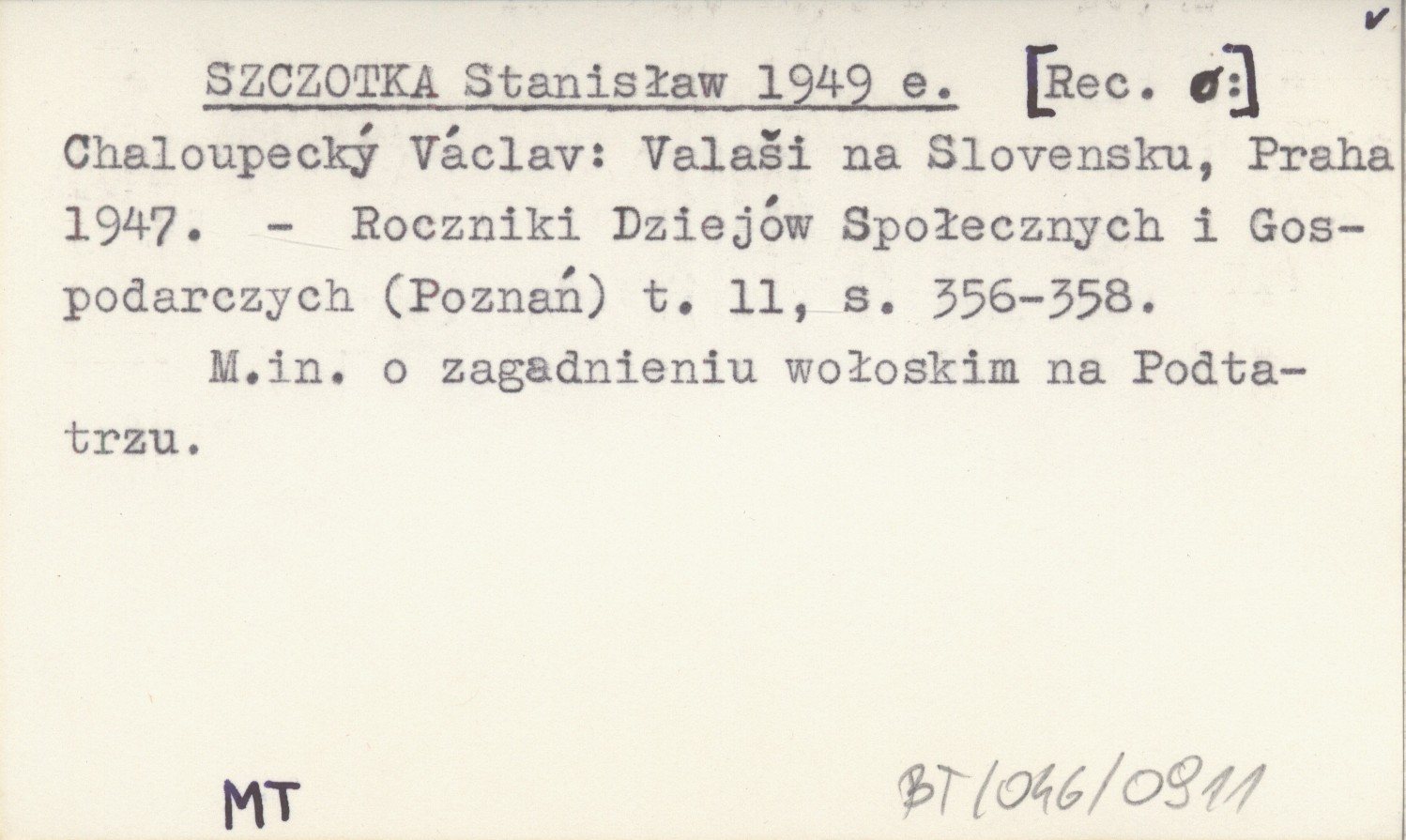 SZCZOTKA Stanisław 1949 e [Rec. o:] Chaloupecký Václav: Valaši na Slovensku, Praha 1947.
