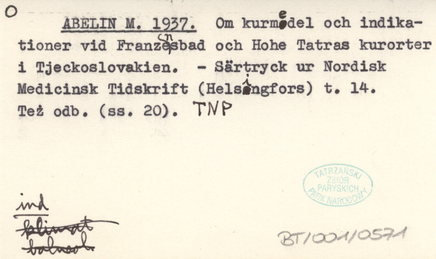 ABELIN M. 1937 Om kurmedel och indikationer vid Franzensbad och Hohe Tatras kurorter i Tjeckoslovakien.