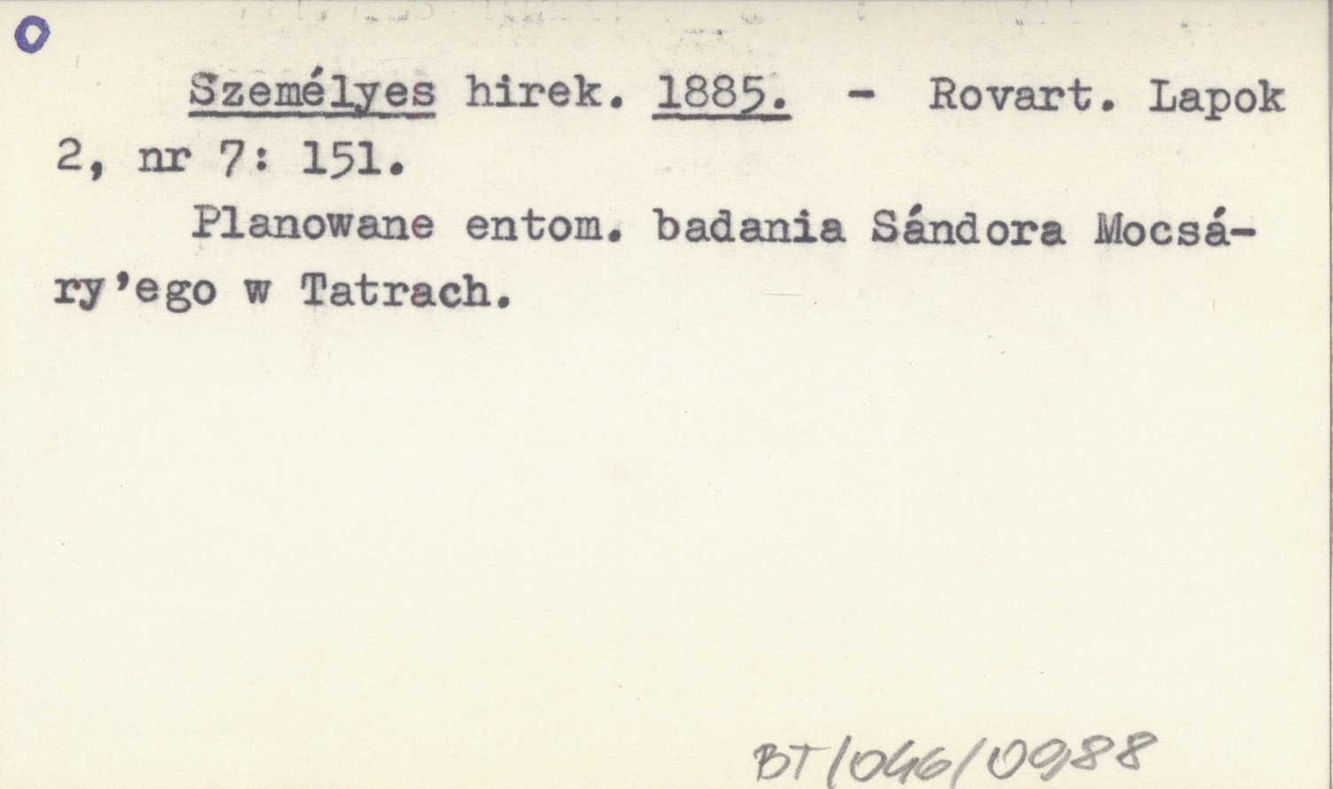 Rovart. Lapok, 2, nr 7: 151. Planowane entomologiczne badania Sándora Mocsáry'ego w Tatrach.