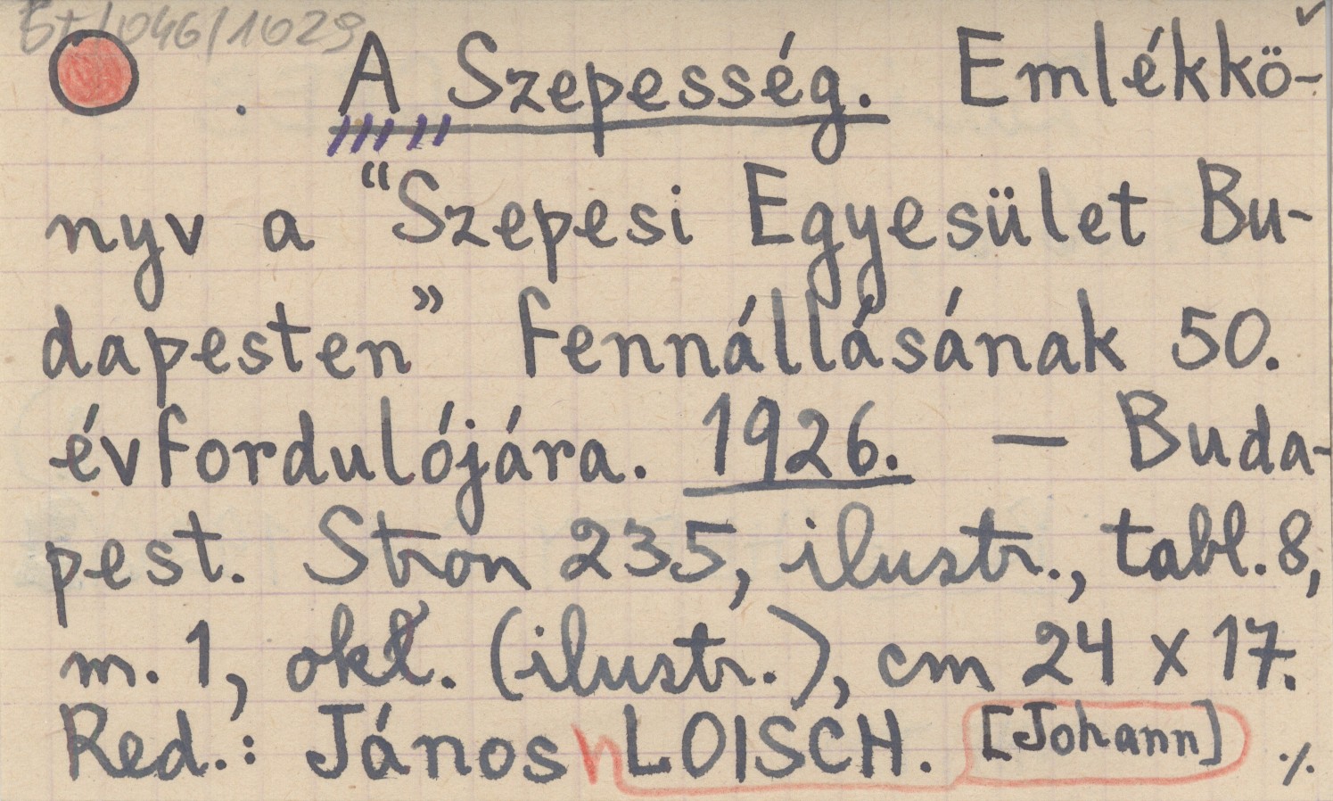 RED: LOISCH, János [Johann]. ; A Szepesség. Emlékkönyv a "Szepesi Egyesület Budapesten" fennállásának 50. évfordulójára. 1926
