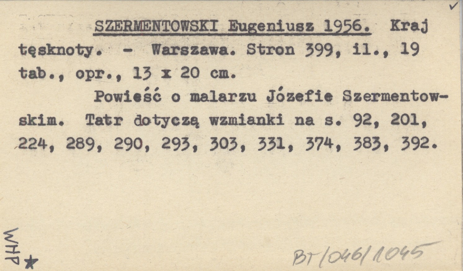 Warszawa , 399 s., il., 19 k., opr., 13x20 cm. Powieść o malarzu Józefie Szermentowskim. Tatr dotyczą wzmianki na s. 92, 201, 224, 289, 290, 293, 303, 331, 374, 383, 392.