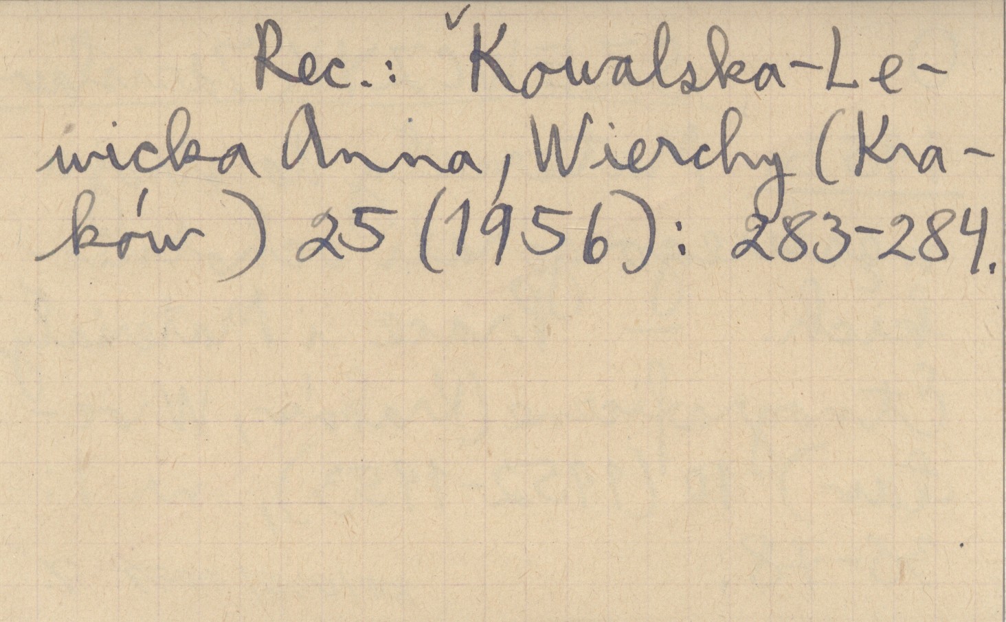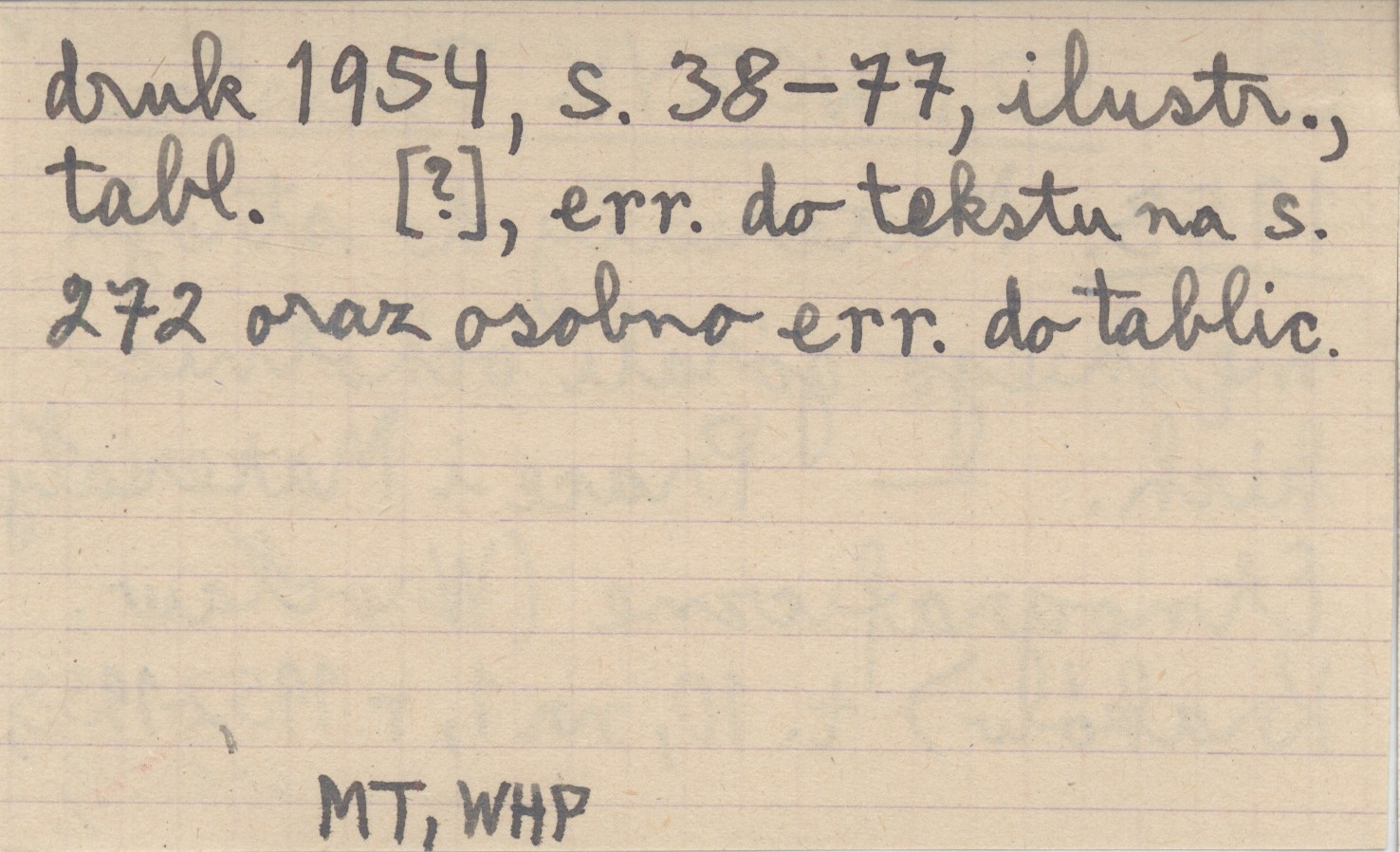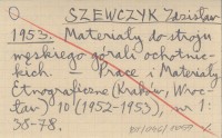 Prace i Materiały Etnograficzne (Wrocław ; Kraków ;) , T. 10, nr 1 (1952-1953, druk 1954): 38-77, il., k., err. (do tekstu na s. 272, do tablic osobno). REC: KOWALSKA-LEWICKA Anna, Wierchy (Kraków) 25 (1956): 283-284.