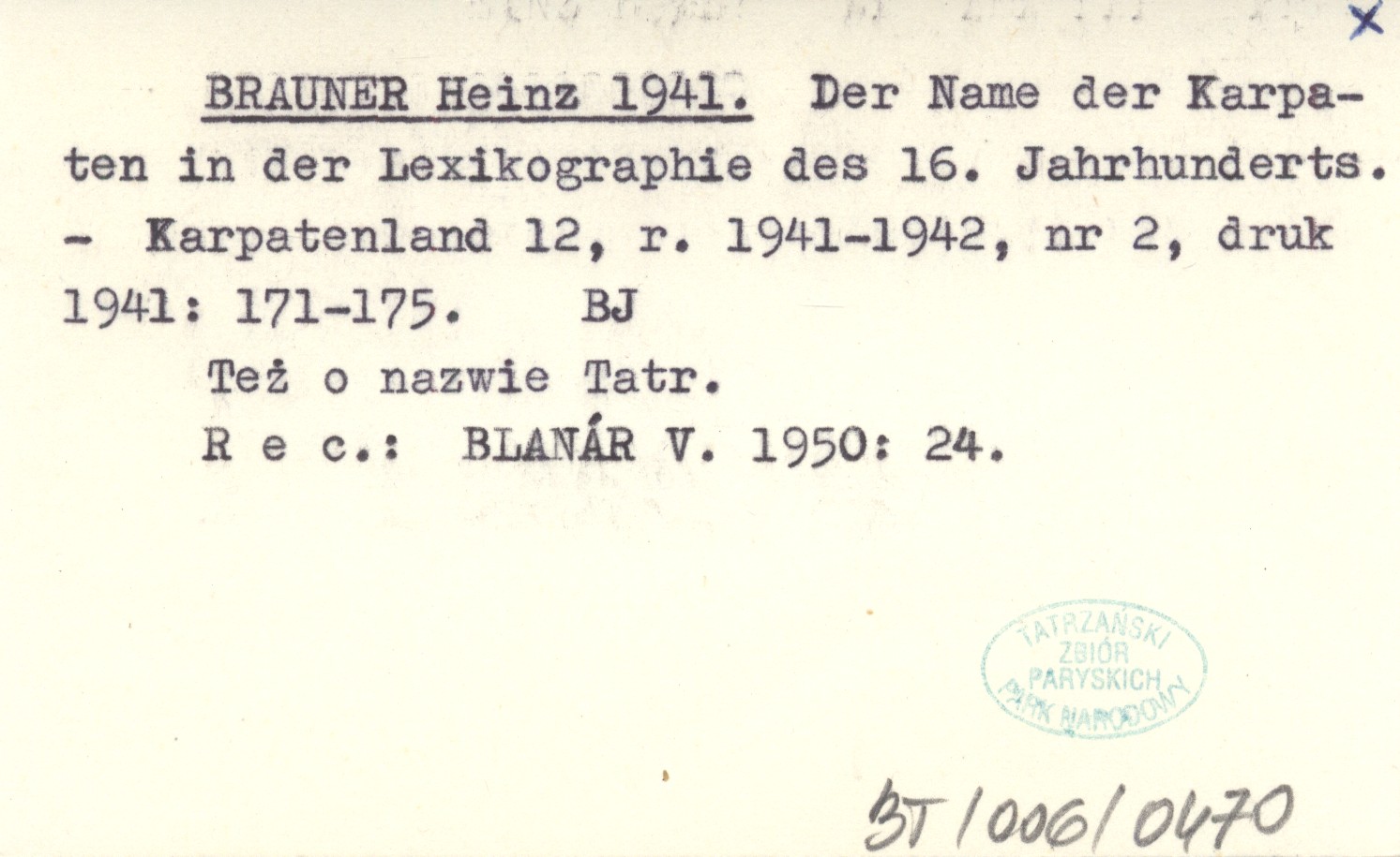 BRAUNER Heinz 1941 Der Name der Karpaten in der Lexikographie des 16. Jahrhunderts.
