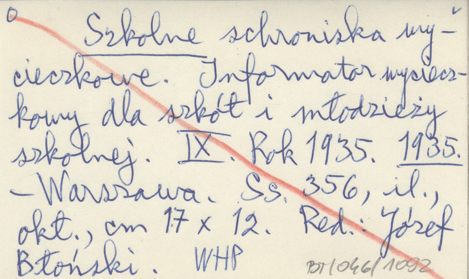 RED: BŁOŃSKI, Józef. ; Szkolne schroniska wycieczkowe. Informator wycieczkowy dla szkół i młodzieży szkolnej. IX. Rok 1935. 1935
