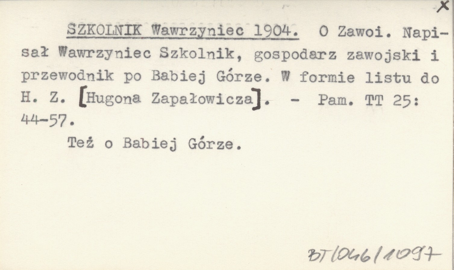 SZKOLNIK Wawrzyniec 1904 O Zawoi. Napisał Wawrzyniec Szkolnik, gospodarz zawojski i przewodnik po Babiej Górze. W formie listu do H. Z. [Hugona Zapałowicza].