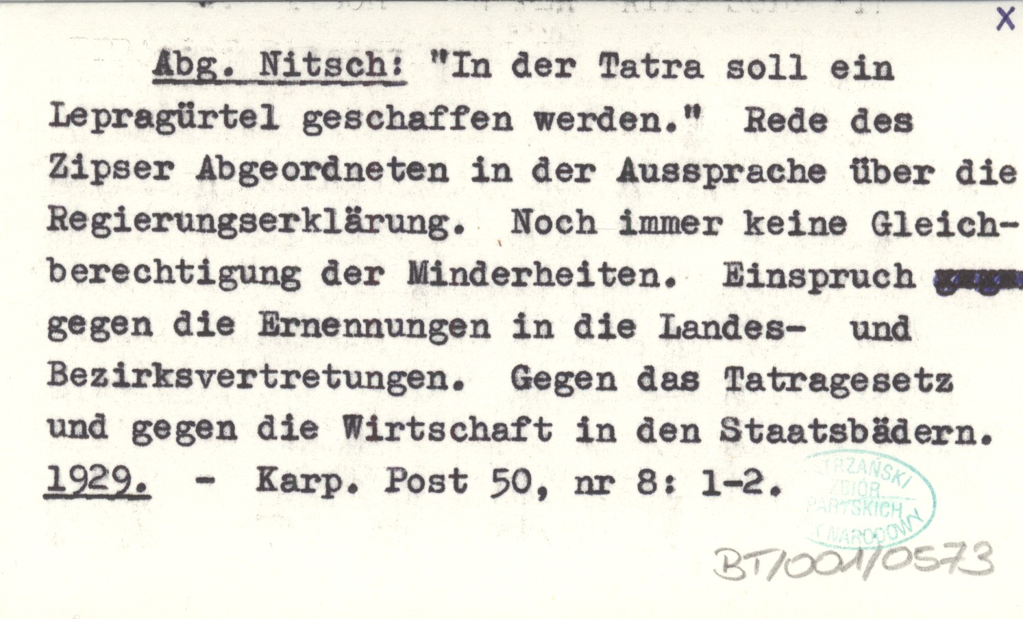 Abg. Nitsch: 1929 "In der Tatra soll ein Lepragürtel geschaffen werden." Rede des Zipser Abgeordneten in der Aussprache über die Regierungserklärung. Noch immer keine Gleichberechtigung der Minderheiten. Einspruch gegen die Ernennungen in die Landes- und Bezirksvertretungen. Gegen das Tatragesetz und gegen die Wirtschaft in den Staatsbädern.