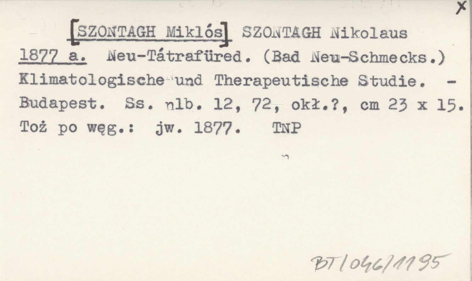 SZONTAGH Nikolaus [SZONTAGH Miklós] 1877 a Neu-Tátrafüred. (Bad Neu-Schmecks). Klimatologische und Therapeutische Studie.