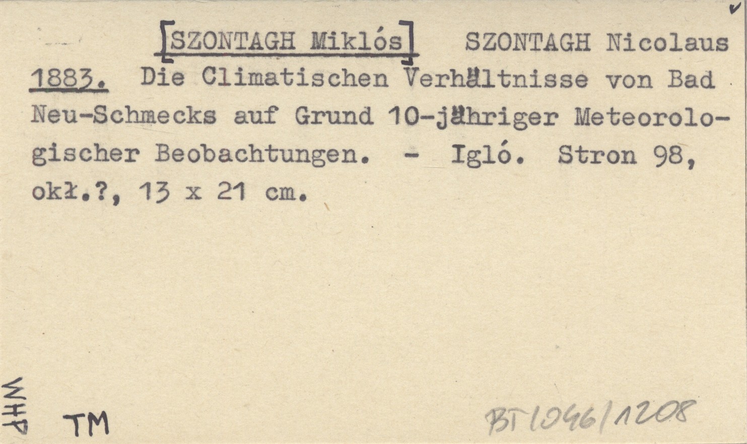 SZONTAGH Nikolaus [SZONTAGH Miklós] 1883 Die Climatischen Verhältnisse von Bad Neu-Schmecks auf Grund 10-jähriger Meteorologischer Beobachtungen.