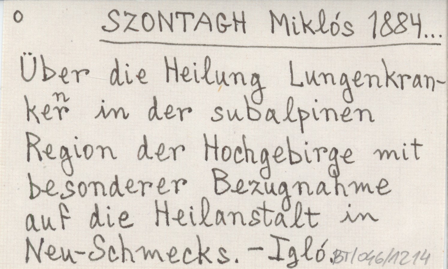 SZONTAGH Miklós 1884... Über die Heilung Lungenkranker in der subalpinen Region der Hochgebirge mit besonderer Bezugnahme auf die Heilanstalt in Neu-Schmecks.
