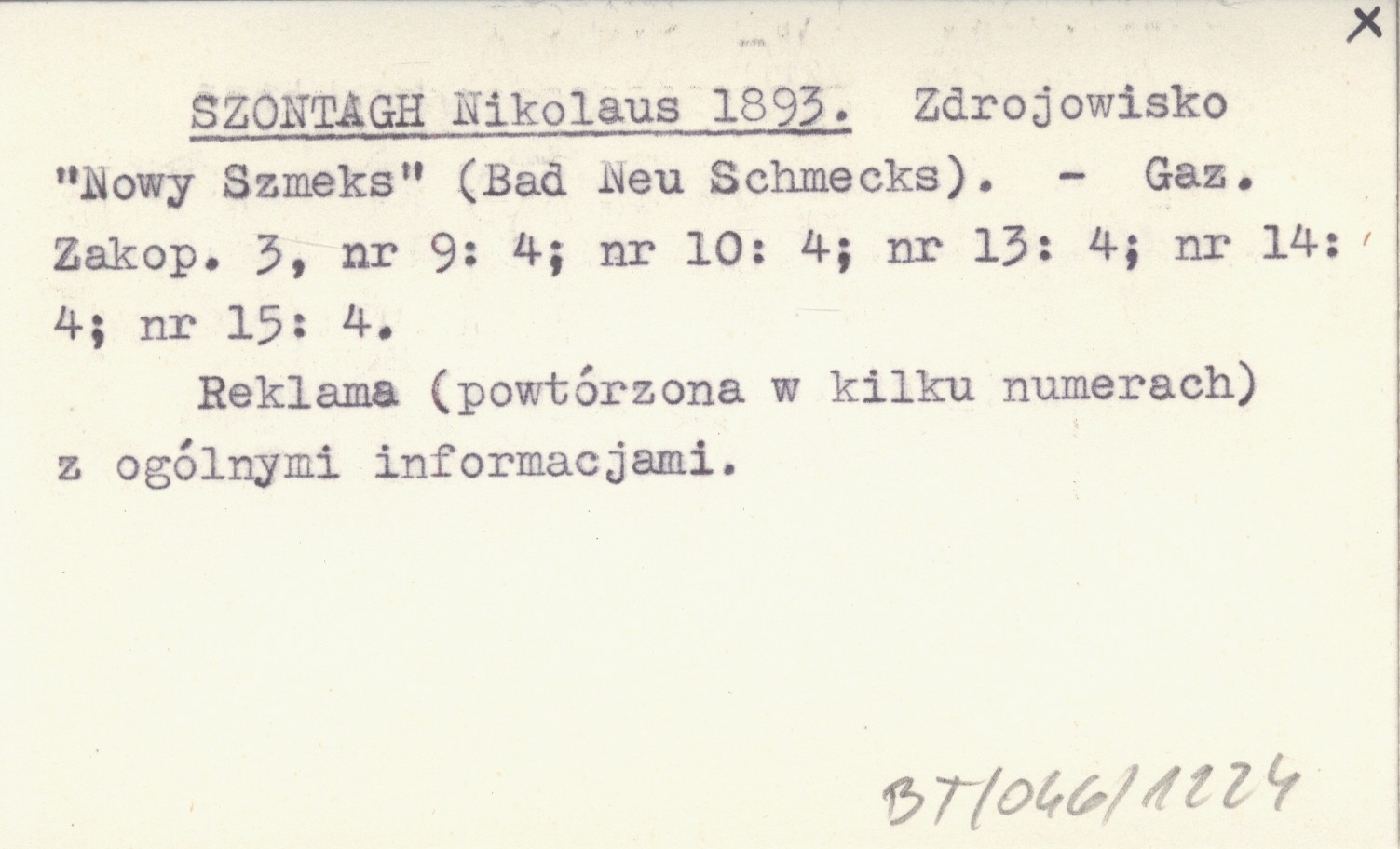 Gazeta Zakopiańska, 3, nr 9: 4 ; nr 10: 4 ; nr 13: 4 ; nr 14: 4 ; nr 15: 4. Reklama (powtórzona w kilku numerach) z ogólnymi informacjami.