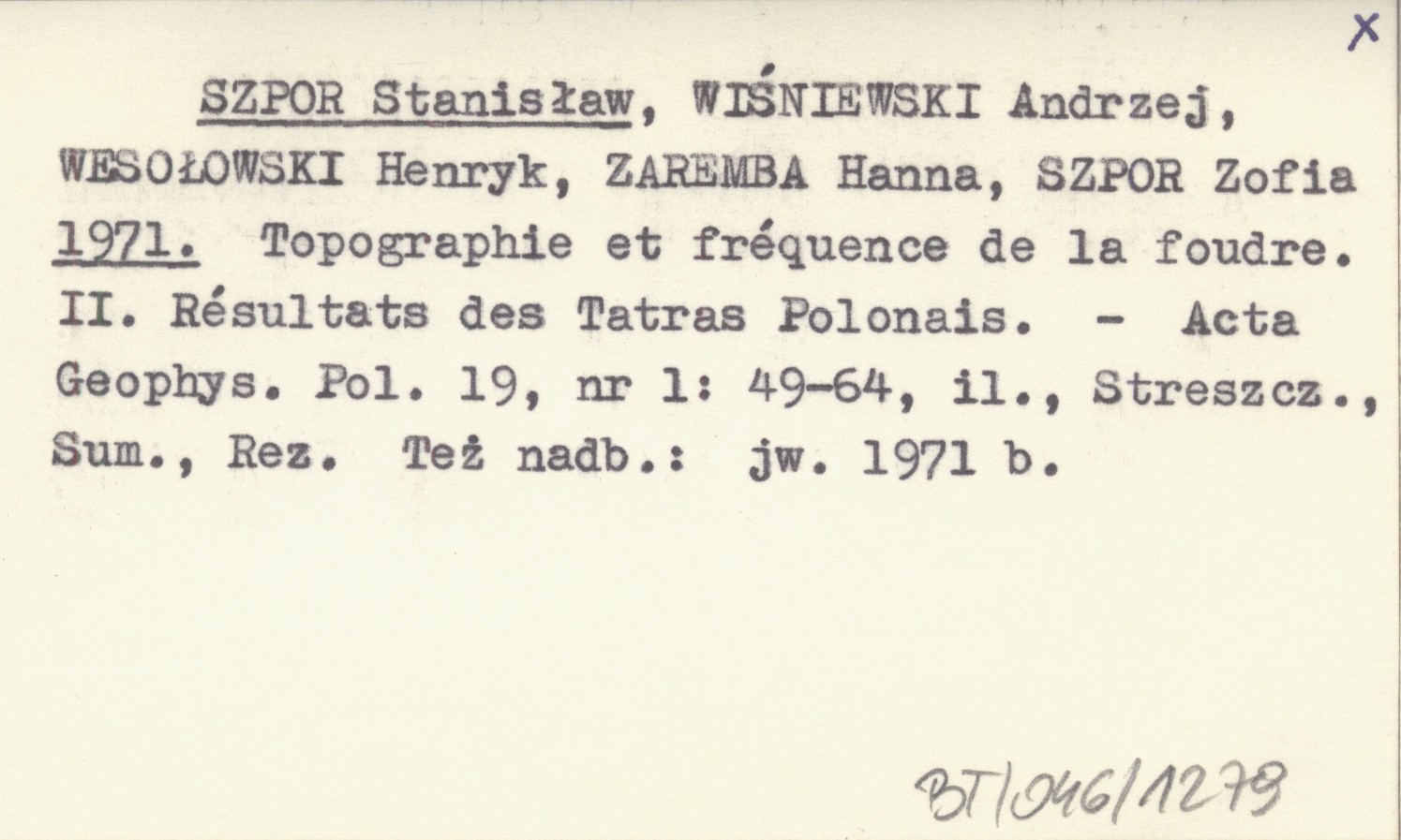 SZPOR Stanisław WIŚNIEWSKI, Andrzej. ; WESOŁOWSKI, Henryk. ; ZAREMBA, Hanna. ; SZPOR, Zofia. ; 1971 Topographie et fréquence de la foudre. II. Résultats des Tatras Polonais.