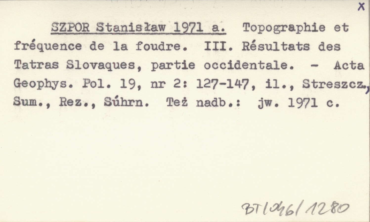 SZPOR Stanisław 1971 a Topographie et fréquence de la foudre. III. Résultats des Tatras Slovaques, partie occidentale.