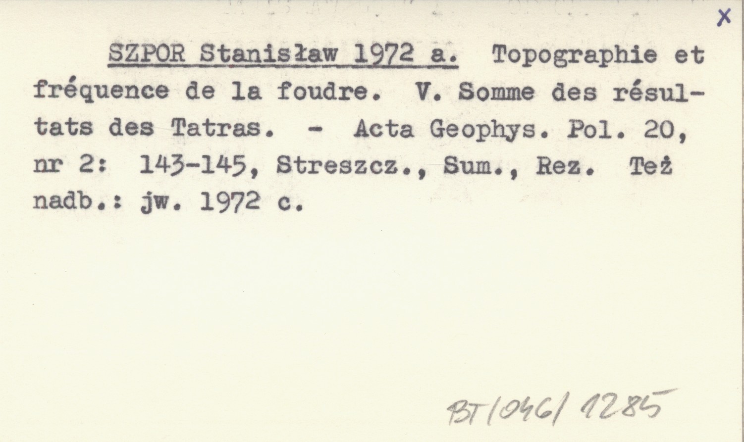 SZPOR Stanisław 1972 a Topographie et fréquence de la foudre. V. Somme des résultats des Tatras.