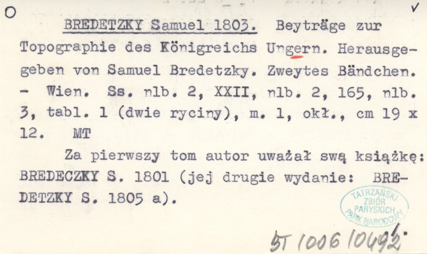 Wien , [2], XXII, [2], 165, [3] s., 1 k. (dwie ryc.), 1 mapa, okł., 19x12 cm. Za pierwszy tom autor uważał swą książkę: BREDECZKY S. 1801 (jej drugie wydanie: BREDETZKY S. 1805 a) REC: Zs. v. u. f. Ungern 5, r. 1804, nr 3: 176-179.- WEBER A. 1916, 1916 b