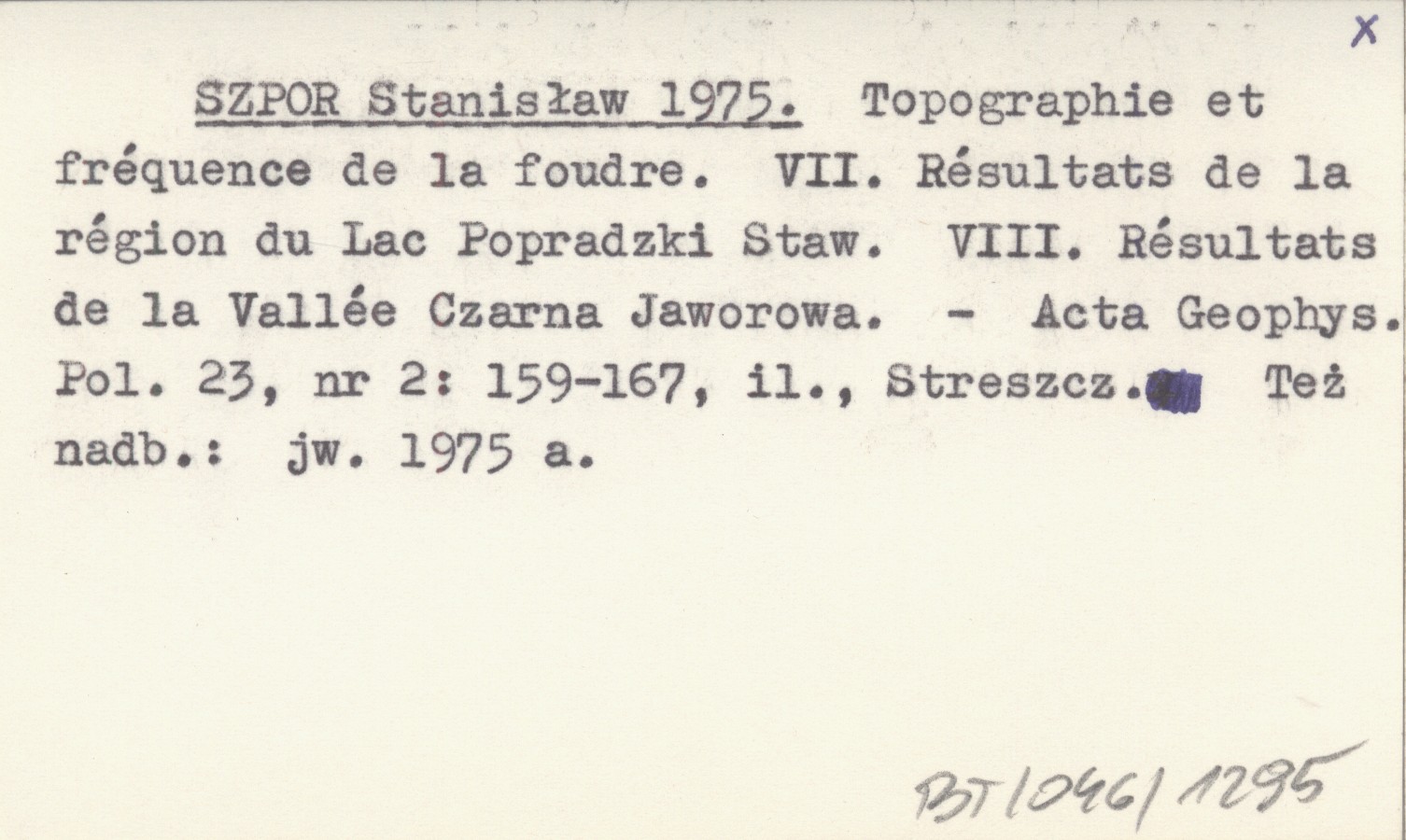 SZPOR Stanisław 1975 Topographie et fréquence de la foudre. VII. Résultats de la région du Lac Popradzki Staw. VIII. Résultats de la Vallée Czarna Jaworowa.