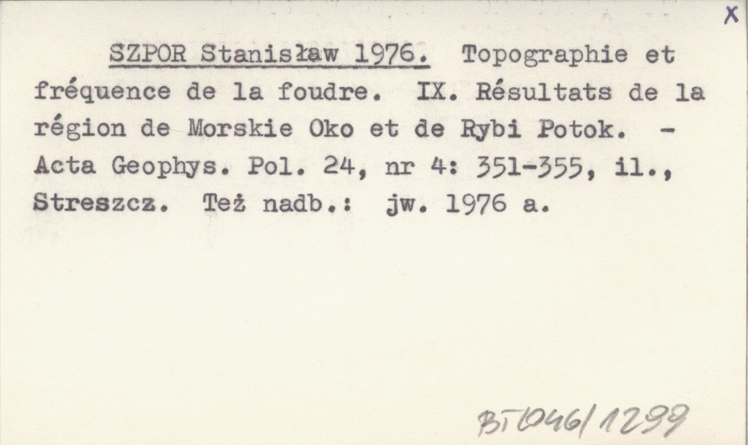 SZPOR Stanisław 1976 Topographie et fréquence de la foudre. IX. Résultats de la région de Morskie Oko et de Rybi Potok.
