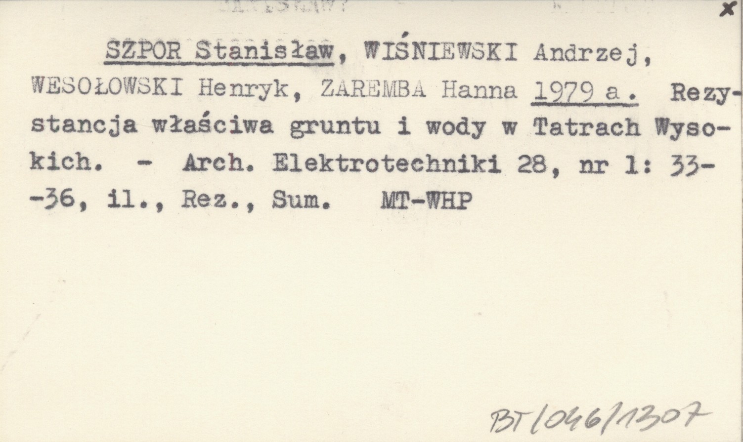 SZPOR Stanisław WIŚNIEWSKI, Andrzej. ; WESOŁOWSKI, Henryk. ; ZAREMBA, Hanna. ; 1979 a Rezystancja właściwa gruntu i wody w Tatrach Wysokich.