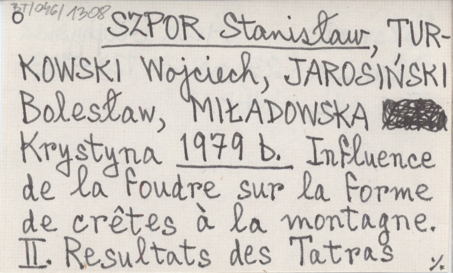 SZPOR Stanisław TURKOWSKI, Wojciech. ; JAROSIŃSKI, Bolesław. ; MIŁADOWSKA, Krystyna. ; 1979 b Influence de la foudre sur la forme de cretes á la montagne. II. Resultats des Tatras Polonais.
