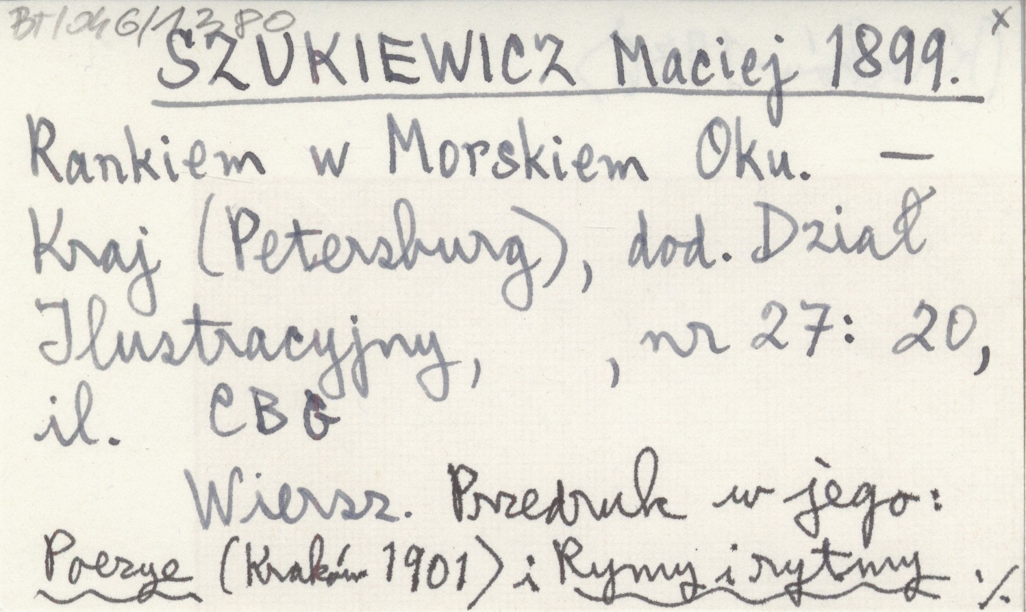 Kraj, dod. Działu Ilustracyjnego (Petersburg) , Nr 27: 20, il. Wiersz. Przedruk w jego: Poezye (Kraków 1901) i Rymy i rytmy (Kraków 1936).