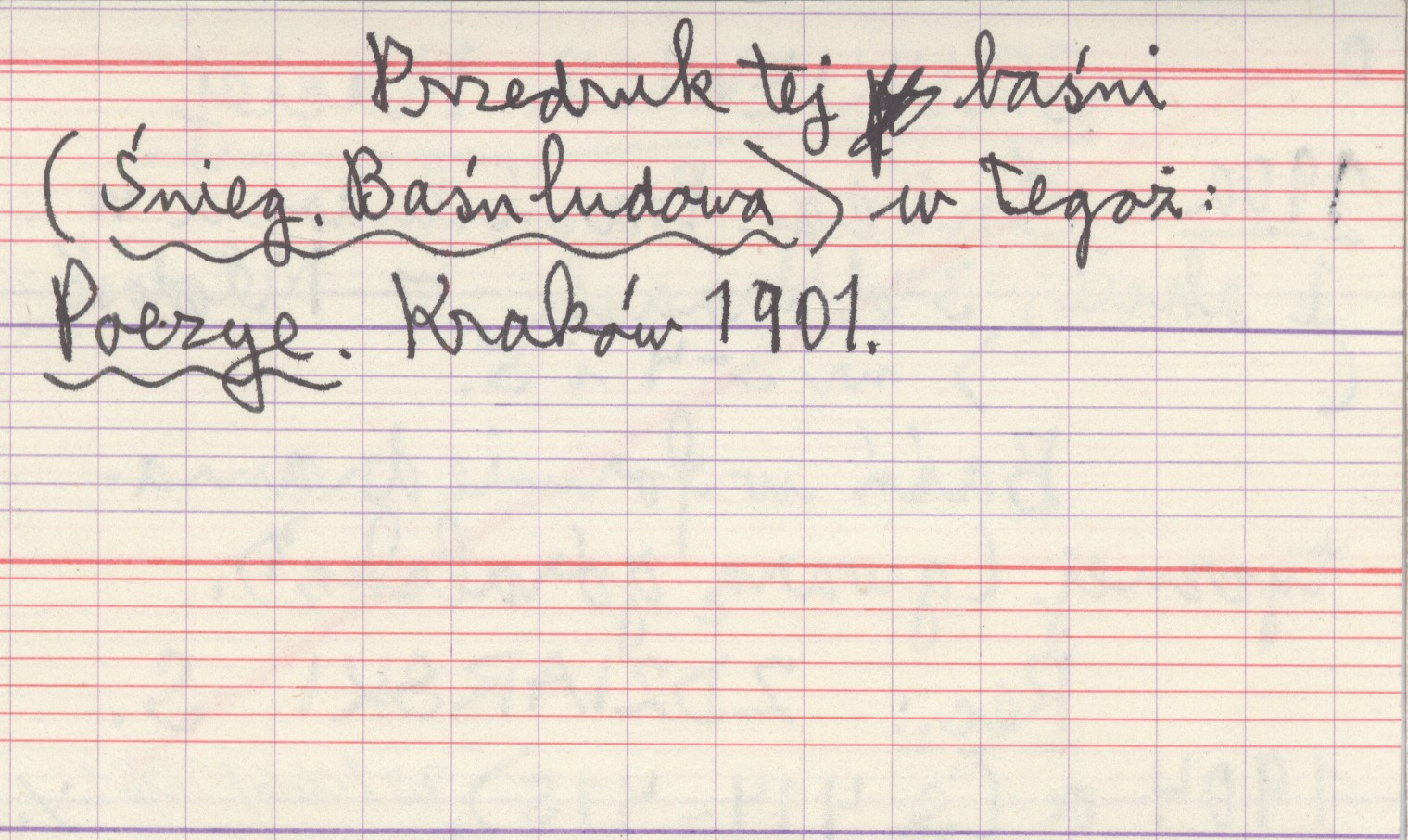 Młodość, Nr 3-4, 5. Baśń w formie dramatycznej (gwarą góralską?). Przedruk tej baśni (Śnieg. Baśń ludowa) w tegoż: Poezye. Kraków 1901. REC: ZDZIARSKI S. 1904 a: 414-415.