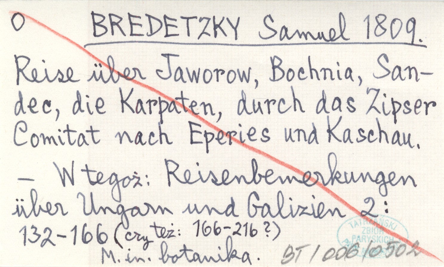 BREDETZKY Samuel 1809 Reise über Jaworow, Bochnia, Sandec, die Karpaten, durch das Zipser Comitat nach Eperies und Kaschau.