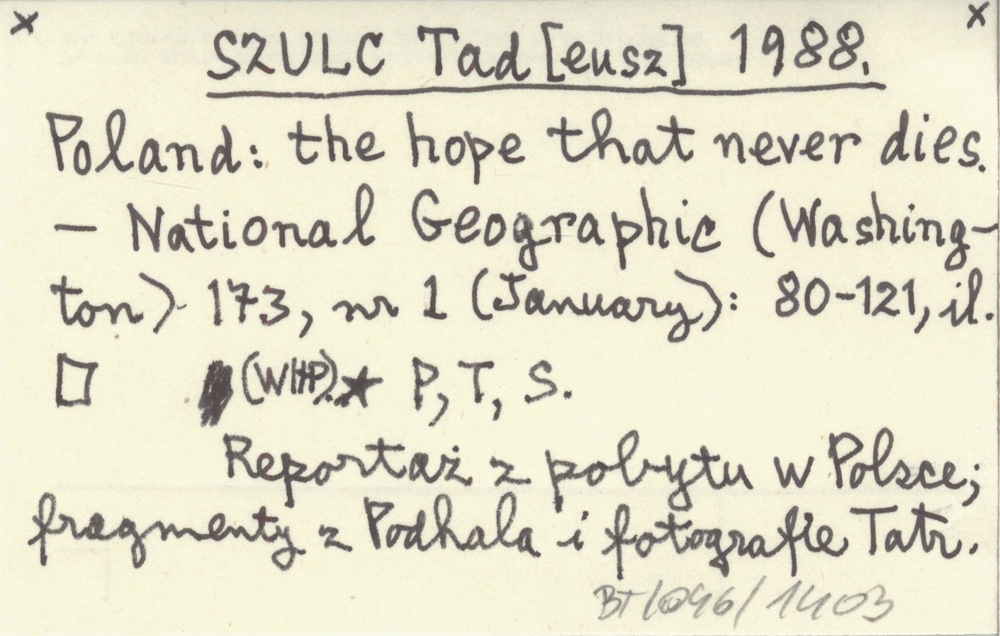 National Geographic (Washington) , 173, nr 1 (January): 80-121, il. Reportaż z pobytu w Polsce, fragmenty z Podhala i fotografie Tatr.