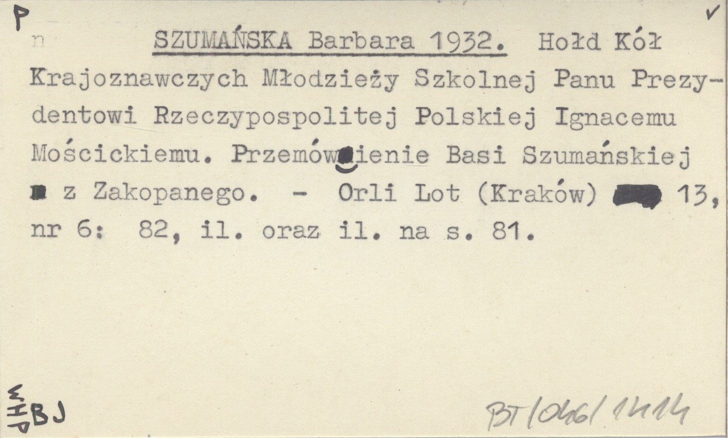 SZUMAŃSKA Barbara 1932 Hołd Kół Krajoznawczych Młodzieży Szkolnej Panu Prezydentowi Rzeczypospolitej Polskiej Ignacemu Mościckiemu. Przemówienie Basi Szumańskiej z Zakopanego.