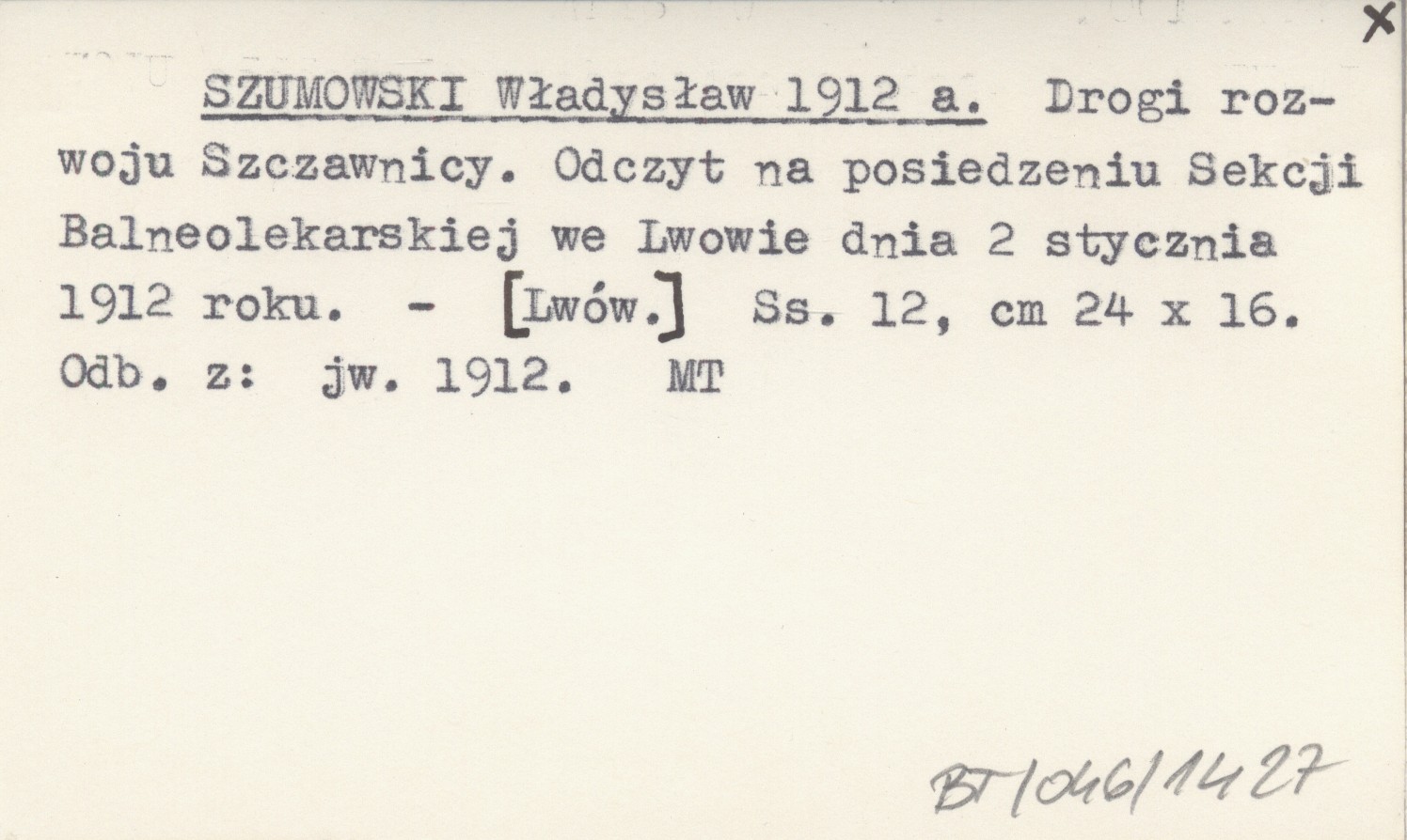 SZUMOWSKI Władysław 1912 a Drogi rozwoju Szczawnicy. Odczyt wygłoszony na posiedzeniu Sekcji Balneolekarskiej we Lwowie dnia 2 stycznia 1912 roku.