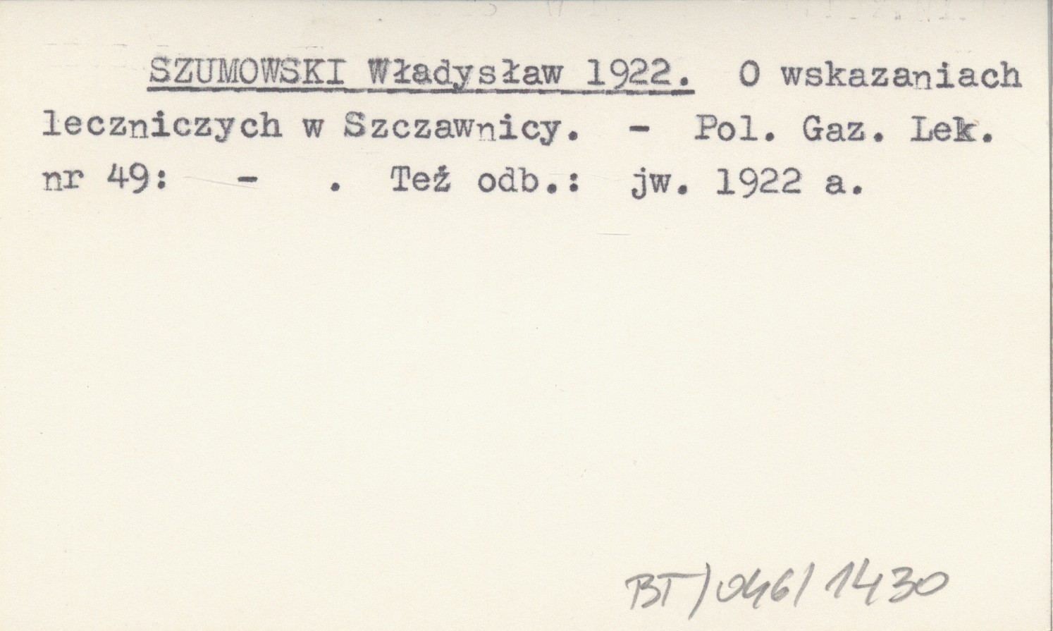 SZUMOWSKI Władysław 1922 O wskazaniach leczniczych w Szczawnicy.