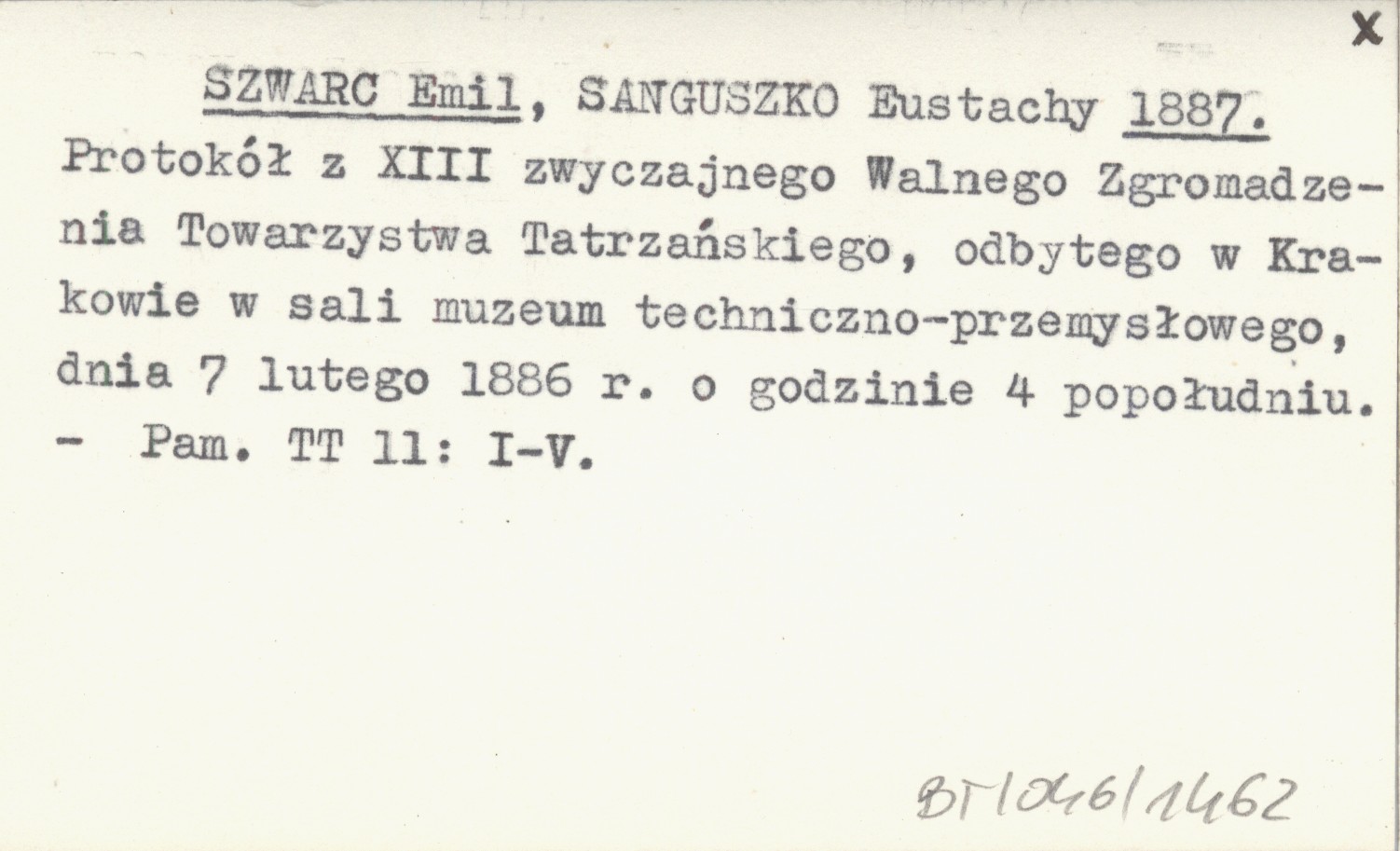 SZWARC Emil SANGUSZKO, Eustachy. ; 1887 Protokół z XIII zwyczajnego Walnego Zgromadzenia Towarzystwa Tatrzańskiego, odbytego w Krakowie w sali muzeum techniczno-przemysłowego, dnia 7 lutego 1886 r. o godzinie 4 popołudniu.