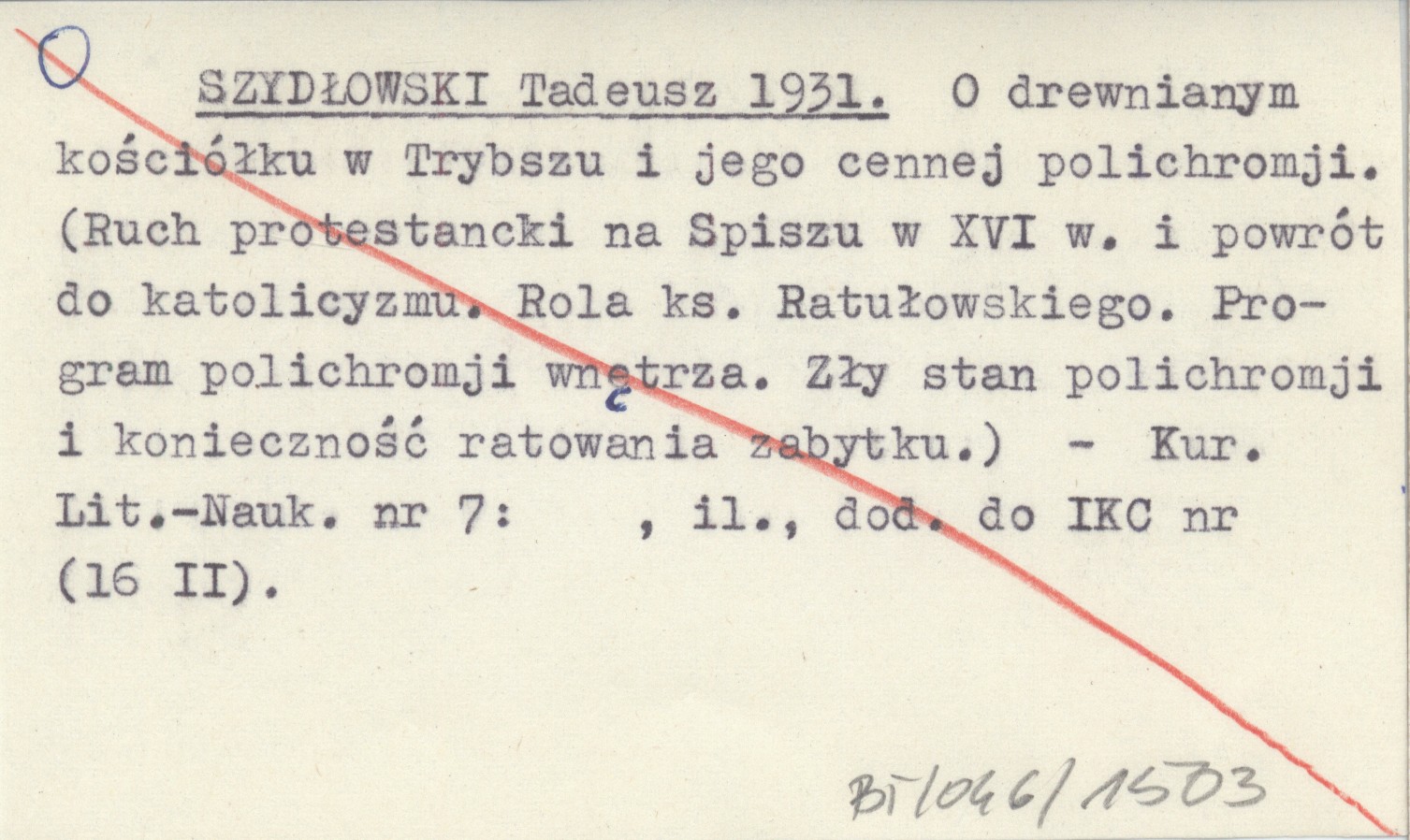 SZYDŁOWSKI Tadeusz 1931 O drewnianym kościółku w Trybszu i jego cennej polochromji. (Ruch protestancki na Spiszu w XVI w. i powrót do katolicyzmu. Rola ks. Ratułowskiego. Program polichromji wnętrza. Zły stan polichromji i konieczność ratowania zabytku).