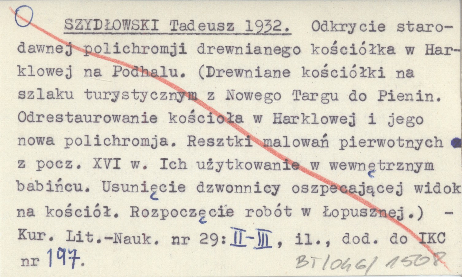 SZYDŁOWSKI Tadeusz 1932 Odkrycie starodawnej polichromji drewnianego kościółka w Harklowej na Podhalu. (Drewniane kościółki na szlaku turystycznym z Nowego Targu do Pienin. Odrestaurowanie kościoła w Harklowej i jego nowa polichromja. Resztki malowań pierwotnych z pocz. XVI w. Ich użytkowanie w wewnętrznym babińcu. Usunięcie dzwonnicy oszpecającej widok na kościół. Rozpoczęcie robót w Łopusznej).