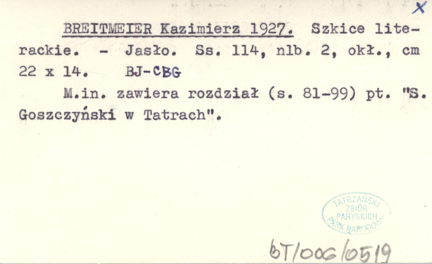 Jasło , 114, [2] s., okł., 22x14 cm. M. in. zawiera rozdział (s. 81-99) pt. "S. Goszczyński w Tatrach".