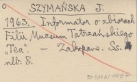 SZYMAŃSKA J. 1963 Informator o zbiorach Filii Muzeum Tatrzańskiego "Tea".