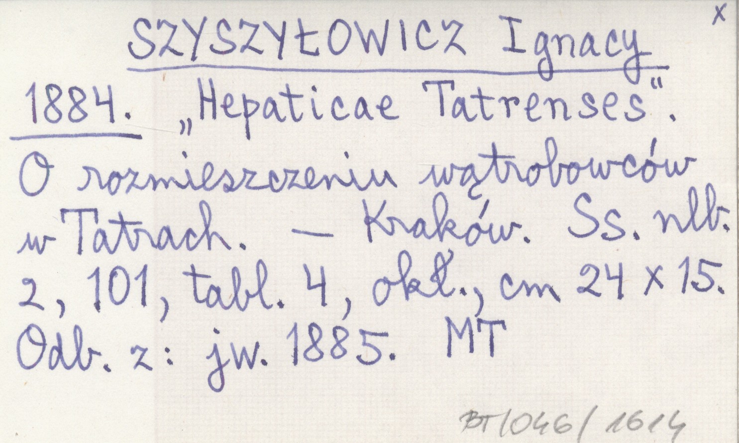 SZYSZYŁOWICZ Ignacy 1884 "Hepaticae Tatrenses". O rozmieszczeniu wątrobowców w Tatrach.