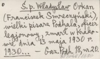 ¦.p. Władysław Orkan (Franciszek Smreczyński), wielki pisarz Podhala, oficer legjonowy, zmarł w Krakowie dnia 13 maja 1930 r. 1930...