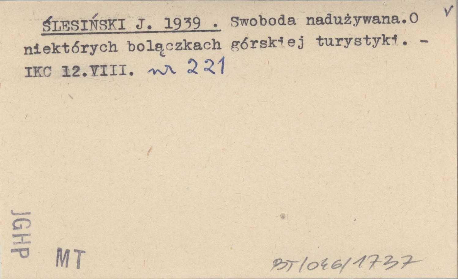 ŚLESIŃSKI J. 1939 Swoboda nadużywana. O niektórych bolączkach górskiej turystyki.