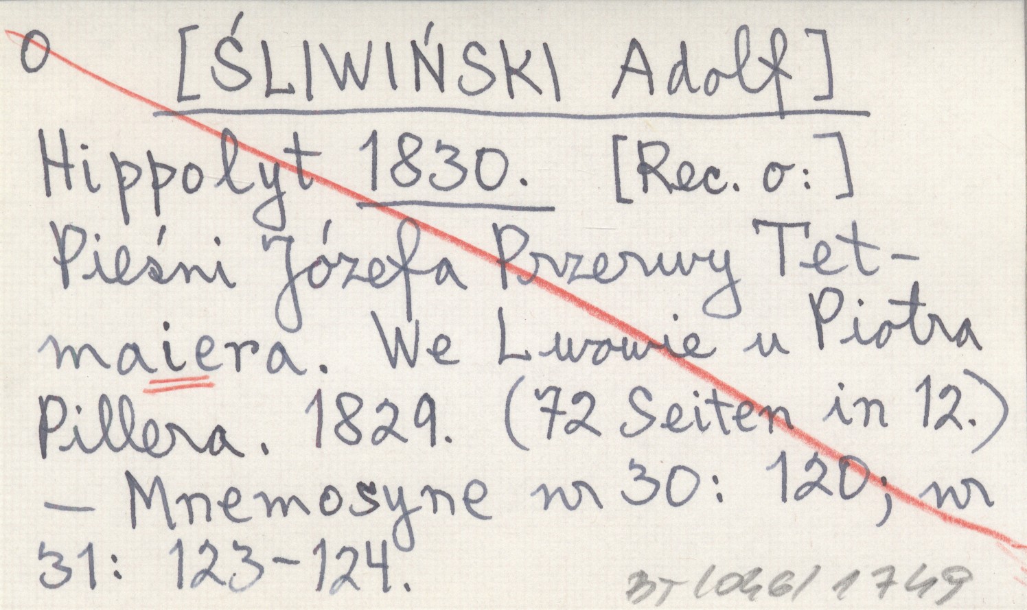 Hippolyt [ŚLIWIŃSKI Adolf] 1830 [Rec. o:] Pieśni Józefa Przerwy Tetmaiera. We Lwowie u Piotra Pillera. 1829. (72 Seiten in 12.).