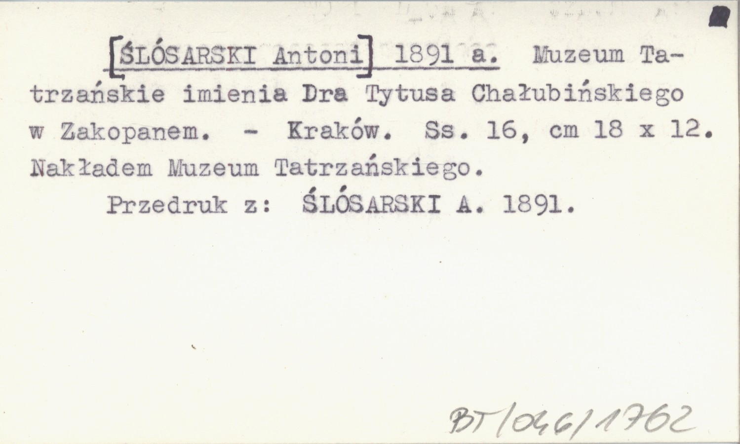 [ŚLÓSARSKI Antoni] 1891 a Muzeum Tatrzańskie imienia Dra Tytusa Chałubińskiego w Zakopanem.