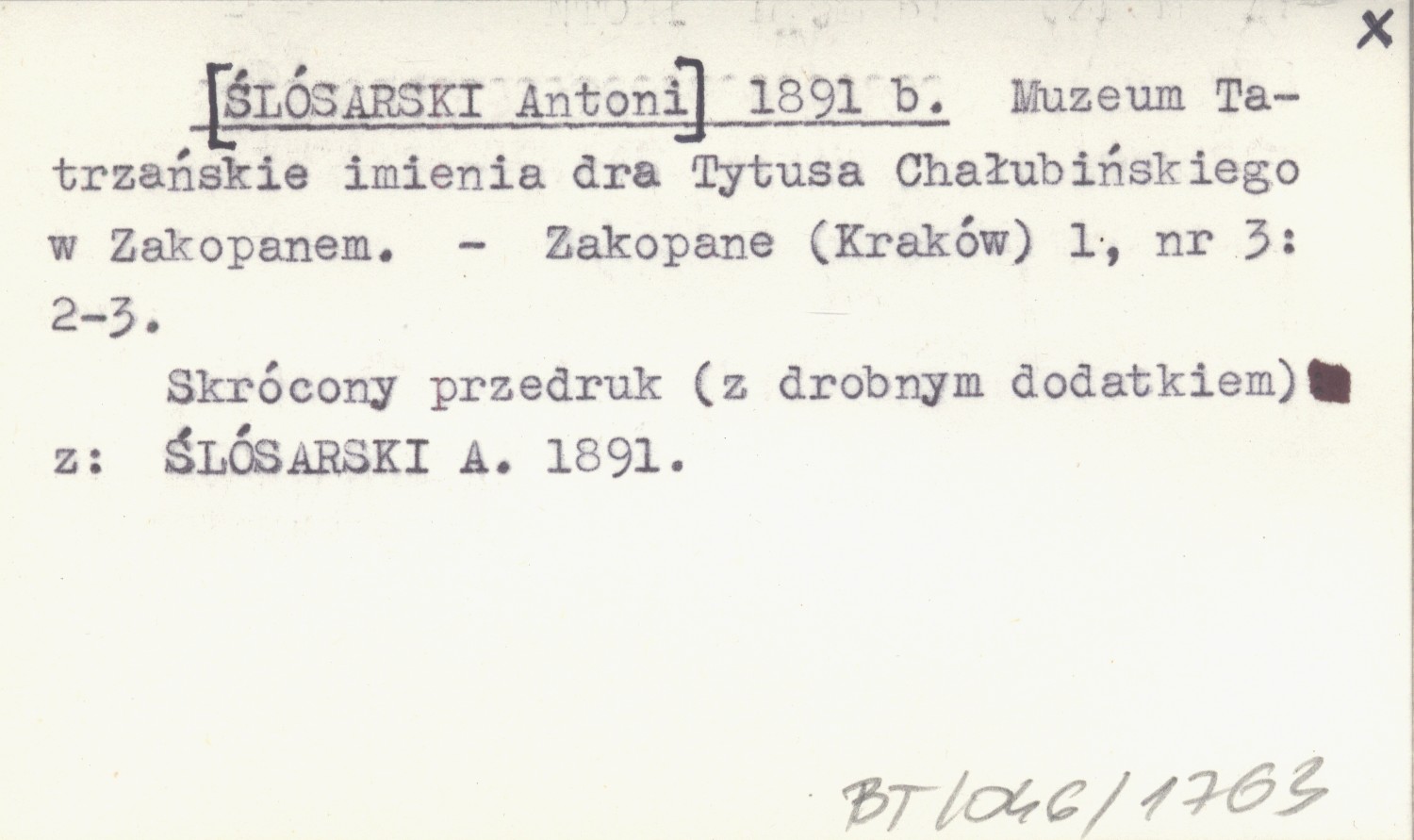 [ŚLÓSARSKI Antoni] 1891 b Muzeum Tatrzańskie imienia Dra Tytusa Chałubińskiego w Zakopanem.