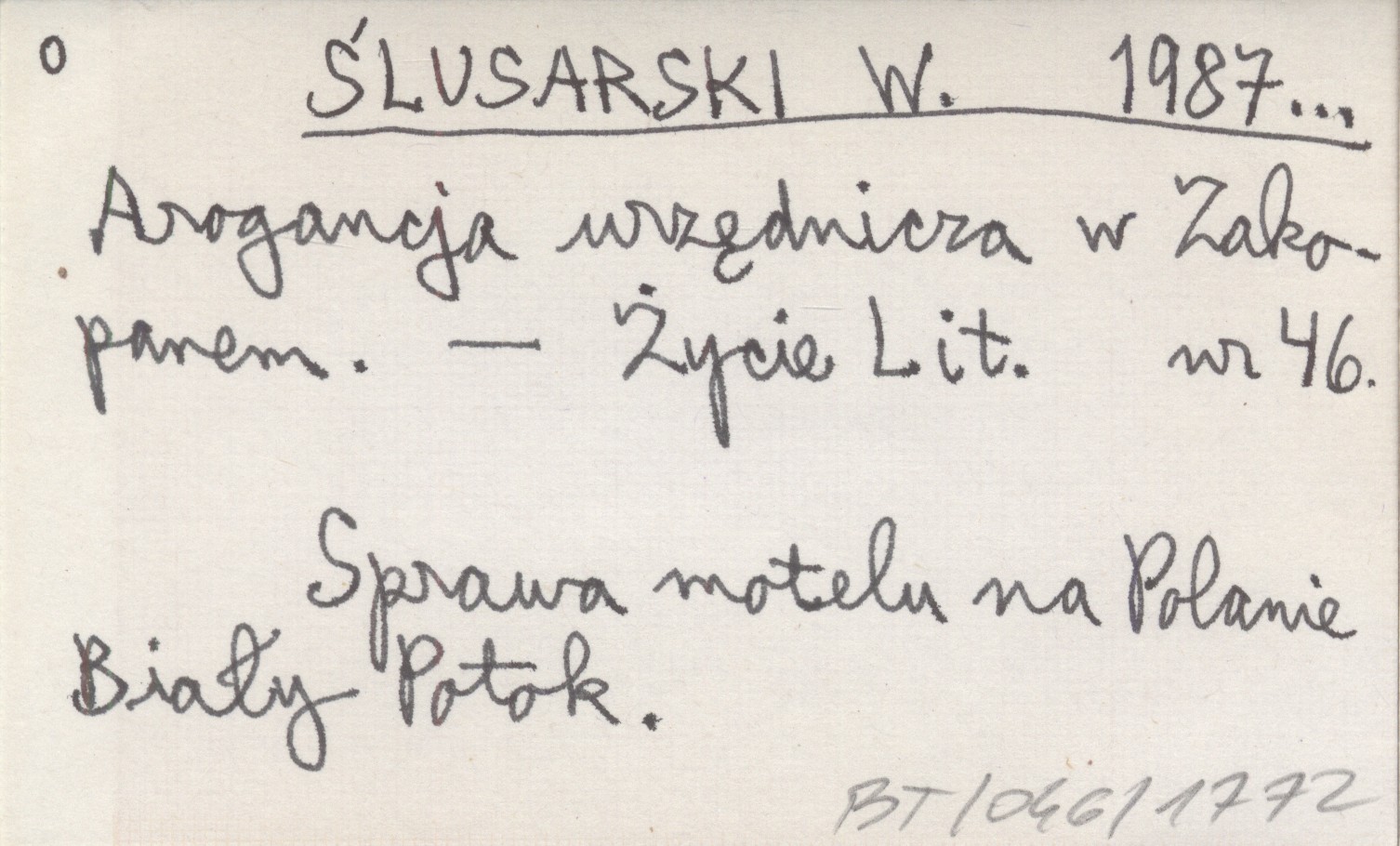 ŚLUSARSKI W. 1987... Arogancja urzędnicza w Zakopanem.