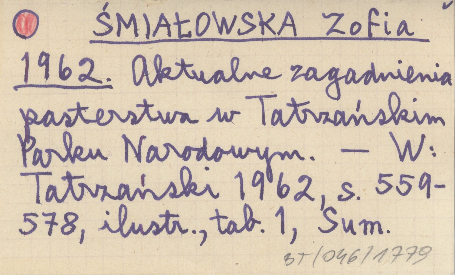 ŚMIAŁOWSKA Zofia 1962 Aktualne zagadnienia pasterstwa w Tatrzańskim Parku Narodowym.