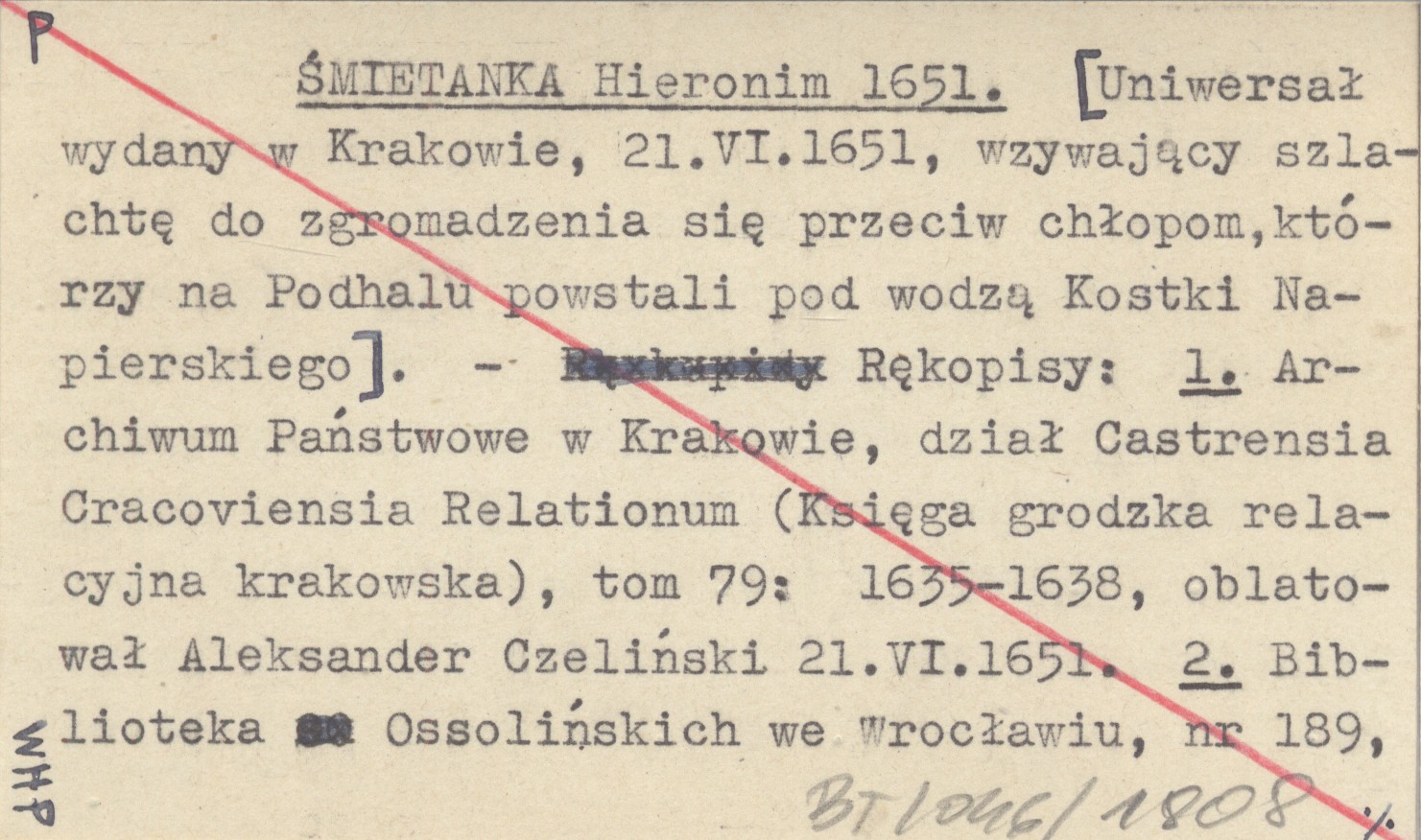 ŚMIETANKA Hieronim 1651 [Uniwersał wydany w Krakowie, 21 VI 1651, wzywający szlachtę do zgromadzenia się przeciw chłopom, którzy na Podhalu powstali pod wodzą Kostki Napierskiego.]