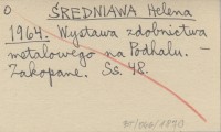 ŚREDNIAWA Helena 1964 Wystawa zdobnictwa metalowego na Podhalu.