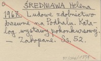 ŚREDNIAWA Helena 1967 Ludowe zdobnictwo drzewne na Podhalu. Katalog wystawy pokonkursowej.