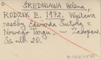ŚREDNIAWA Helena RODZIK, E. ; 1972 Wystawa rzeźby Edwarda Sutora z Nowego Targu.