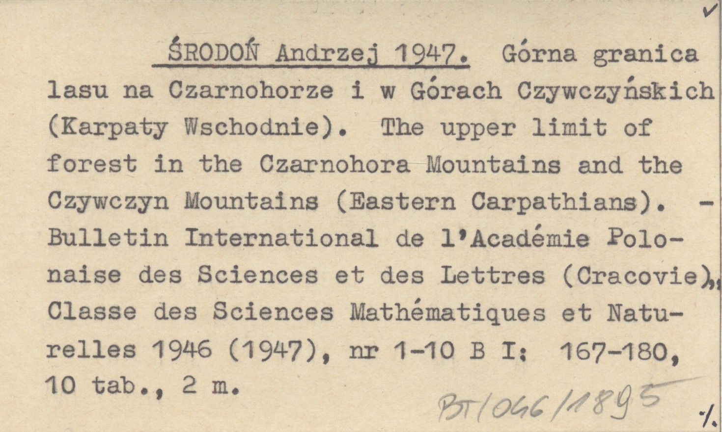 ŚRODOŃ Andrzej 1947 Górna granica lasu na Czarnohorze i w Górach Czywczyńskich (Karpaty Wschodnie). The upper limit of forest in the Czarnochora Mountains and the Czywczyn Mountains (Eastern Carpathians).