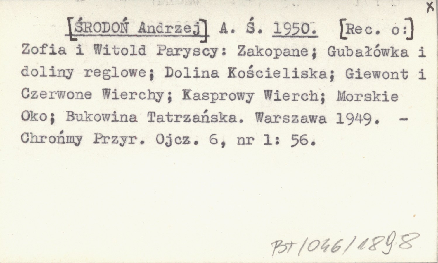 A. Ś. [ŚRODOŃ Andrzej] 1950 [Rec. o:] Zofia i Witold Paryscy: Zakopane ; Gubałówka i doliny reglowe ; Dolina Kościeliska ; Giewont i Czerwone Wierchy ; Kasprowy Wierch ; Morskie Oko ; Bukowina Tatrzańska. Warszawa 1949.