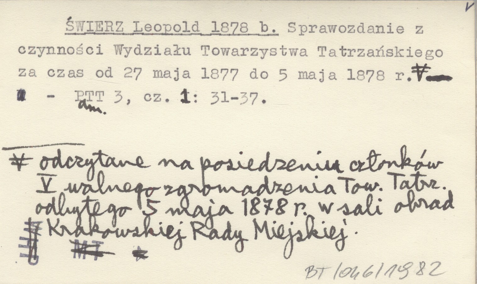 ŚWIERZ Leopold 1878 b Sprawozdanie z czynności Wydziału Towarzystwa Tatrzańskiego za czas od 27 maja 1877 do 5 maja 1878 r. odczytane na posiedzeniu członków V walnego zgromadzenia Tow. Tatrz. odbytego 5 maja 1878 r. w sali obrad Krakowskiej Rady Miejskiej.